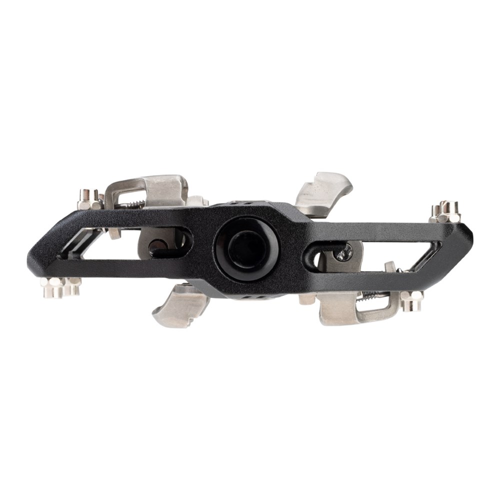 A Trail and All-Mtn clipless pedal body CNC-machined out of 6061-T6 aluminum. It utilizes an ultra-robust forged and CNC-machined chromoly steel axle. The fully serviceable triple-bearings system consists of a LSL self-lubricating bushing, a needle bearing, and an industrial roller bearing. Quad seals keep the internals remain dry in any conditions. The dual-sided clip-in system is compatible with classic SPD cleats. The retention system has an adjustable spring tension to finetune entry and relase, while offering 5 degrees of free float. The medium platform around the clip-in system provides a solid shoe support for power transfer, and the dropped front portions facilitate shoe entry. Four removable pins increase stability and traction in technical situations when disengaged from the pedal.